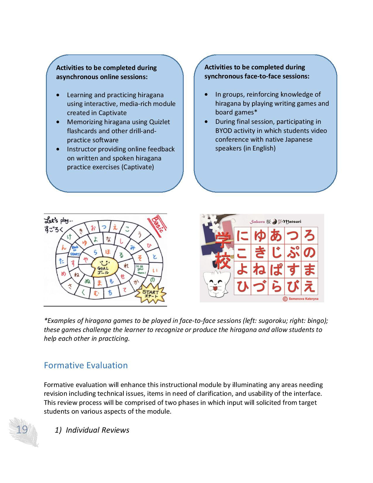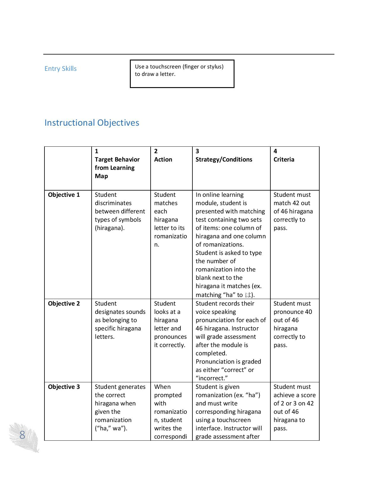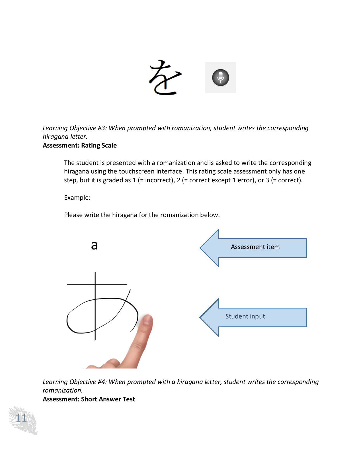 This instructional module for learning the Japanese alphabet "hiragana" incorporates learning theory into an instructional systems design approach. I developed the module using Adobe Captivate.